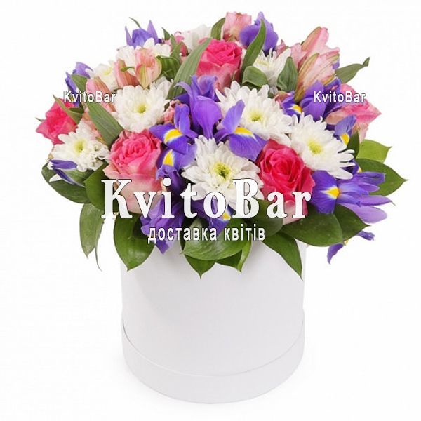 5 white chrysanthemums, 7 pink roses, 10 irises, 5 alstroemerias, box