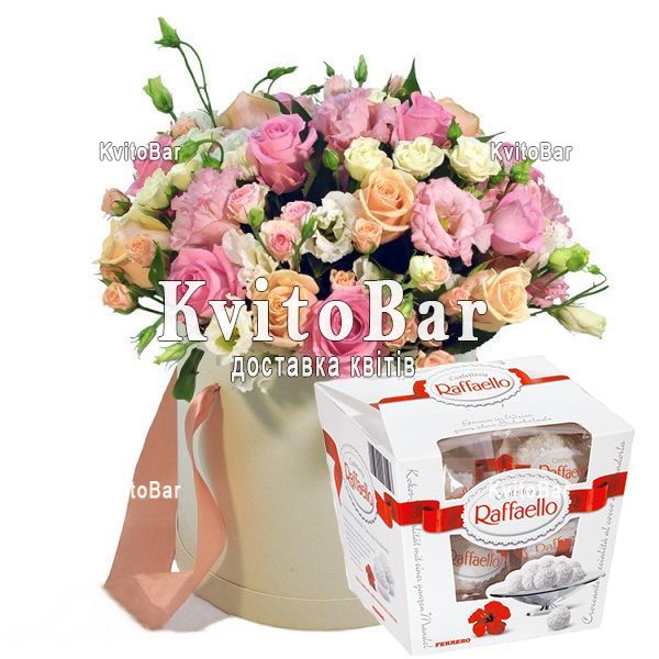 10 roses, 11 bush roses, 10 eustoma, box + Raffaello 150 g