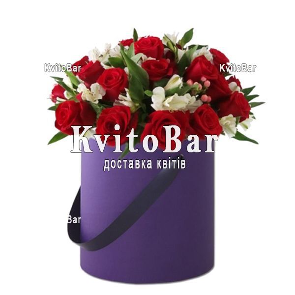 21 red roses, 8 white alstroemerias, box