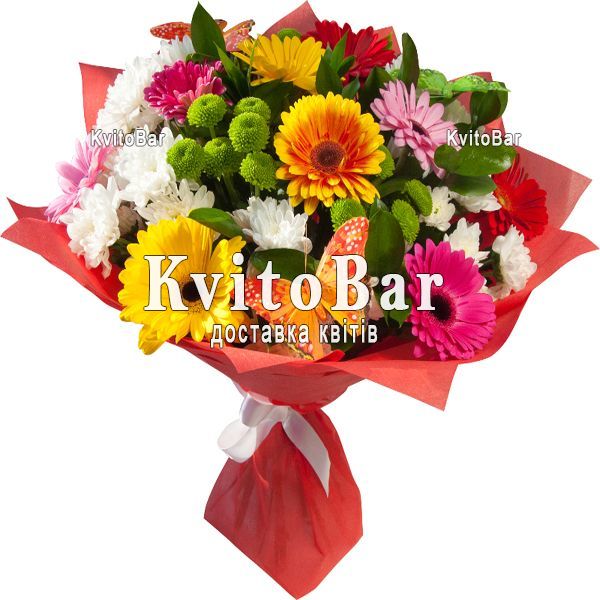 9 multicolored gerberas, 6 chrysanthemums, greenery, floral decor