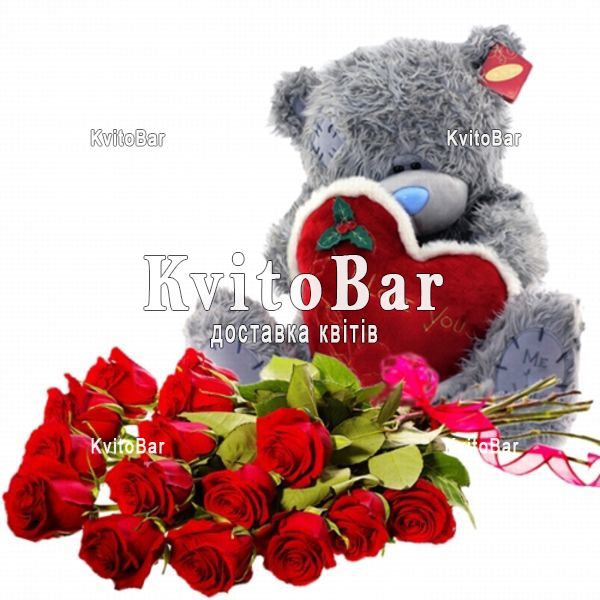 15 red roses, decoration, teddy bear 30-40 cm, packaging