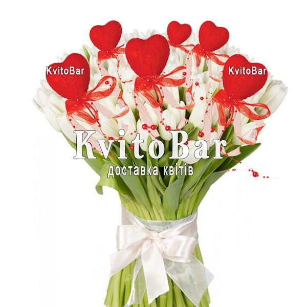 75 белых тюльпанов, оформление, 7 декоративных сердца