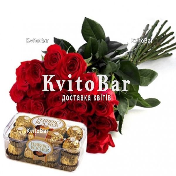 21 імпортна червона троянда, оформлення, цукерки Ferrero Rocher