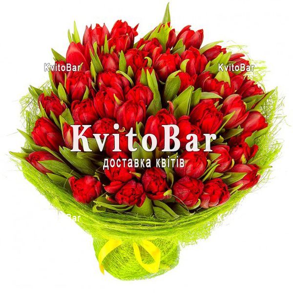 Склад:35 червоних тюльпанів, оформлення