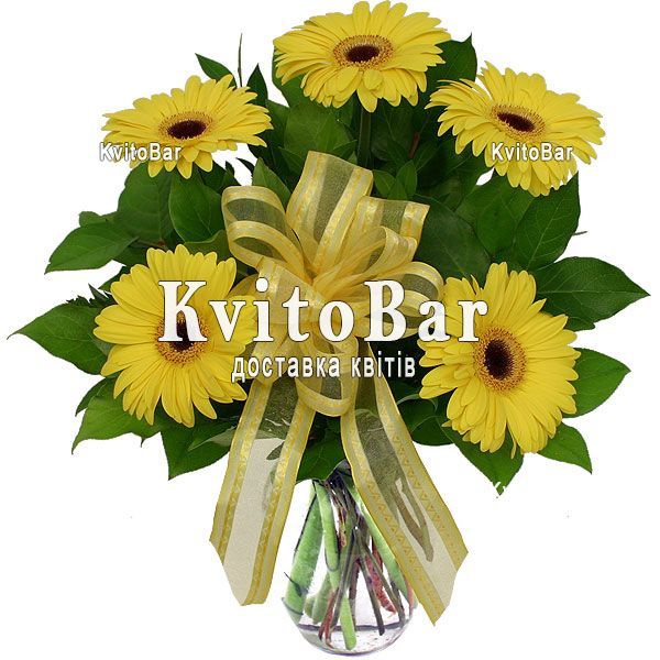 Склад:5 жовтих гербер, зелень, оформлення