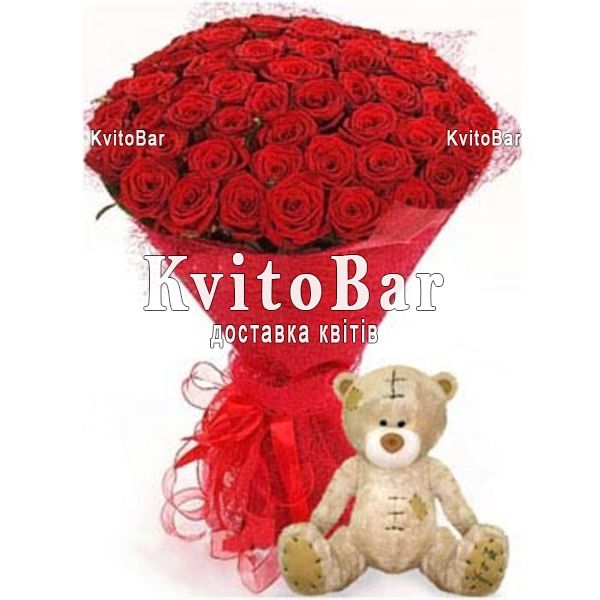 51 червона троянда, оформлення, ведмедик 25-30 см, упаковка