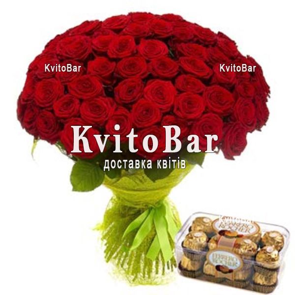 51 червона троянда, оформлення, цукерки Ferrero Rocher
