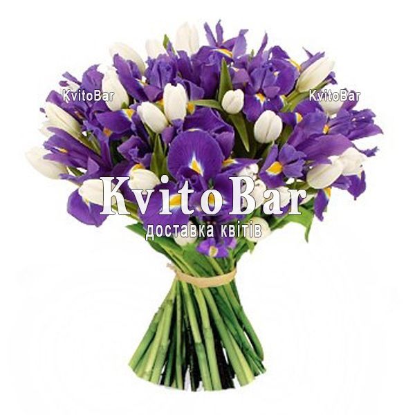 26 синіх ірисів, 25 білих тюльпанів, оформлення