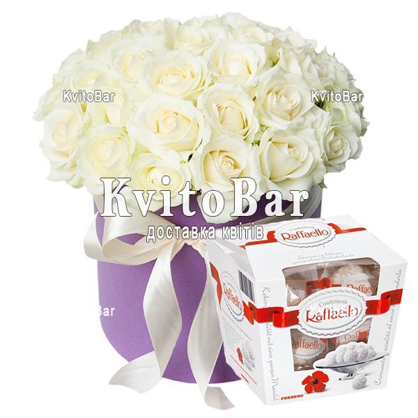 39 білих троянд, коробка + Raffaello 150 г