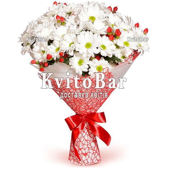 11 ромашкових хризантем, гіперікум, оформлення
