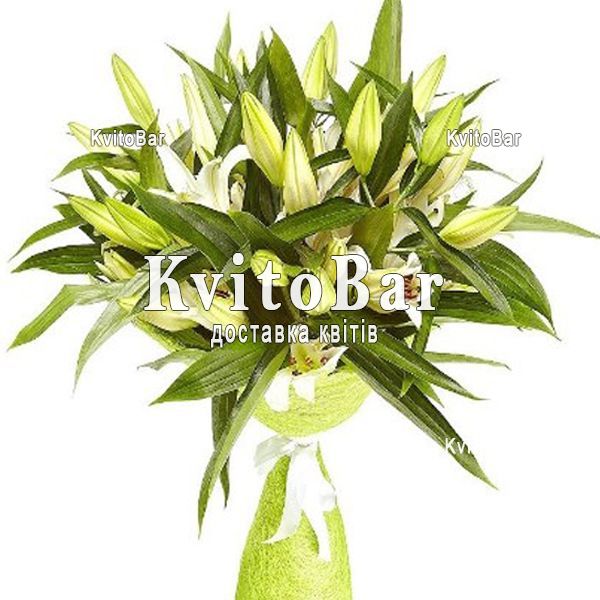 Особливості товару:Бутони лілій у букеті можуть бути як у повністю закритому вигляді, так і у повністю розкритому вигляді або частково відкриті та закриті. Матеріал, колір, форма, стиль упаковки може відрізнятись від зображеного на фото