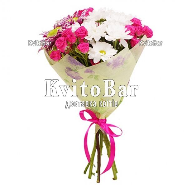 3 кущові троянди, 4 білих хризантеми, оформлення