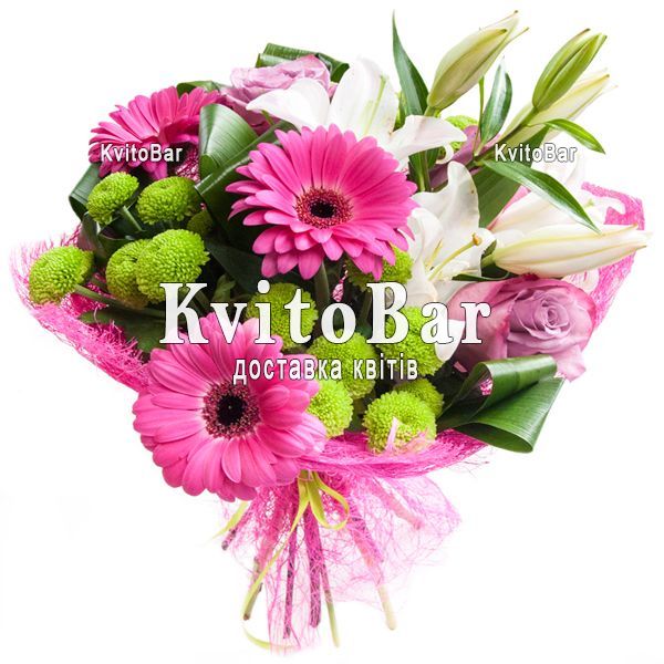 3 рожеві троянди, 3 гербери, 1 гілка лілії, 2 зелені хризантеми, зелень, оформлення