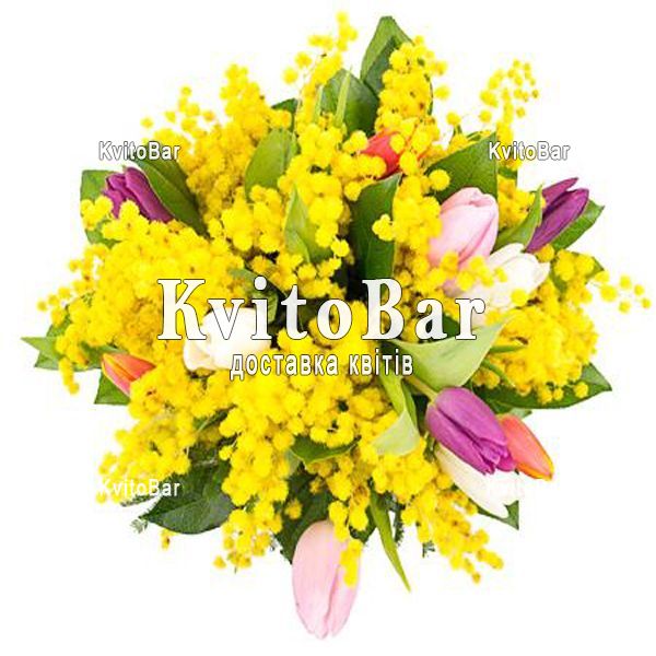 Букет із 11 тюльпанів і 8 мімоз