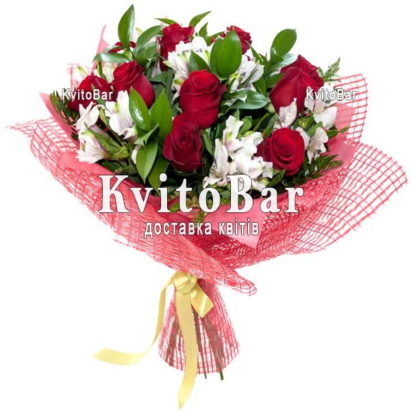 11 червоних троянд, 8 альстромерій, оформлення