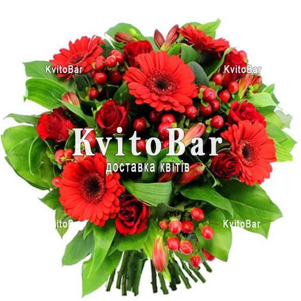 5 гербер, 7 червоних троянд, 5 альстромерій, зелень, оформлення