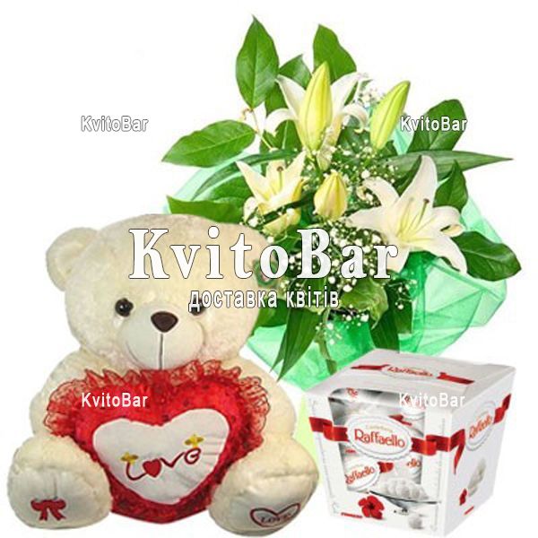 3 лілії, Ведмедик 20-30 см, цукерки Raffaello