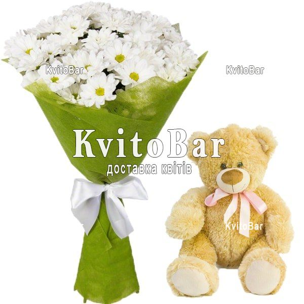 5 білих ромашкових хризантем, Ведмедик 30-40 см