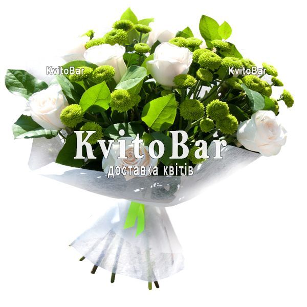 5 кремових троянд, 6 зелених хризантем, зелень, оформлення