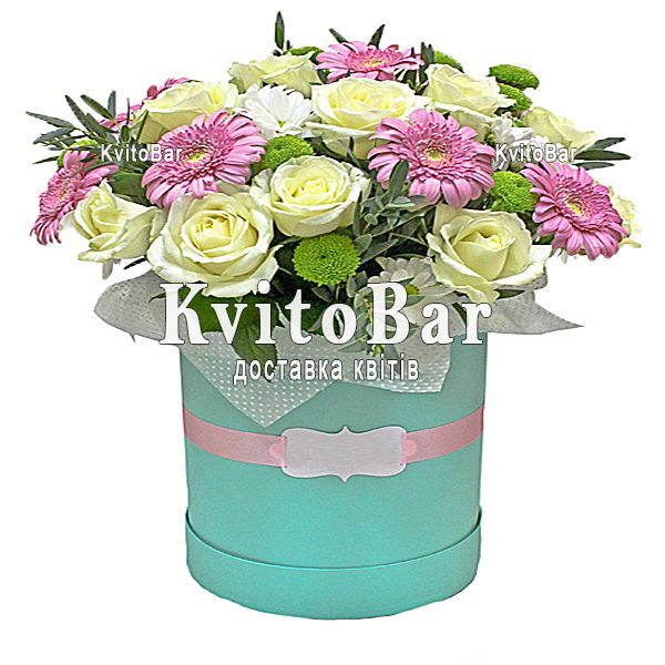 13 білих троянд, 7 рожевих гербер, 5 хризантеми, коробка