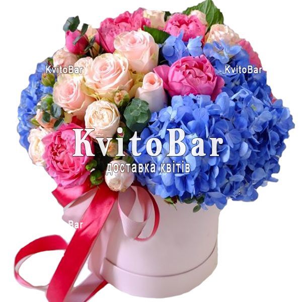 10 кремових троянд, 15 кущових троянд, 2 гортензії, коробка