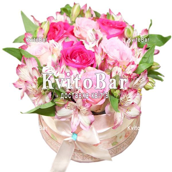 7 рожевих троянд, 8 рожевих альстромерій, коробка