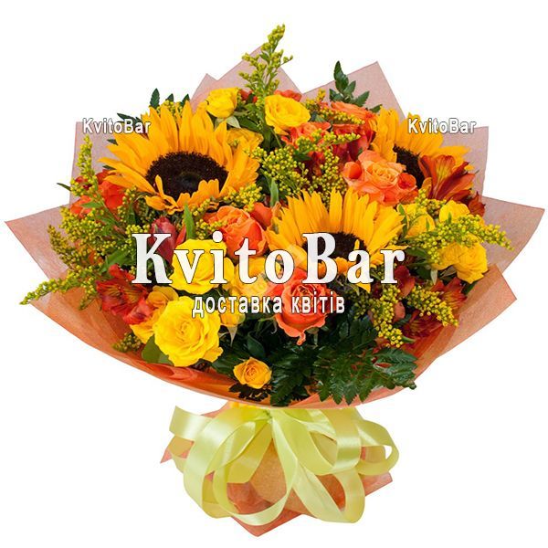 3 жовті кущові троянди, 6 помаранчевих троянд, 5 альстромерій, 3 соняшника, зелень, оформлення