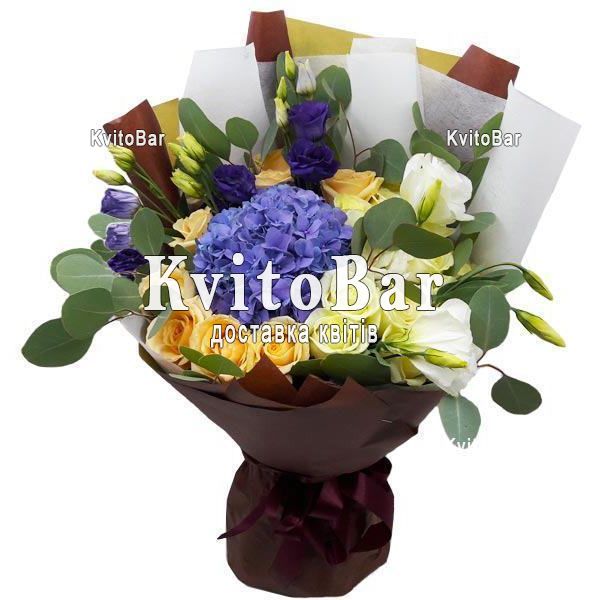 Букет з гортензії, троянд та еустом