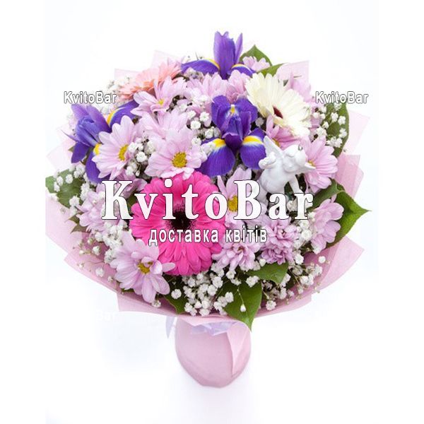 3 іриса, 3 гербери, 5 хризантем, гіпсофіла, оформлення