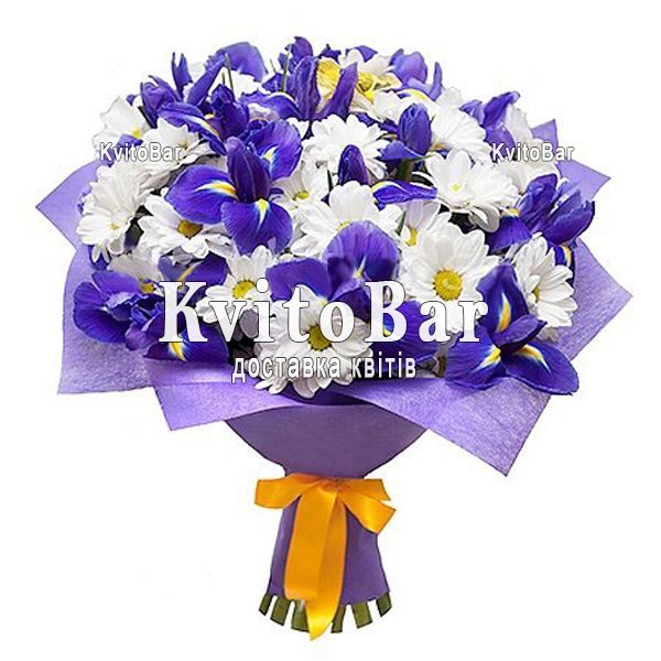 10 синіх ірисів, 9 білих хризантем, оформлення