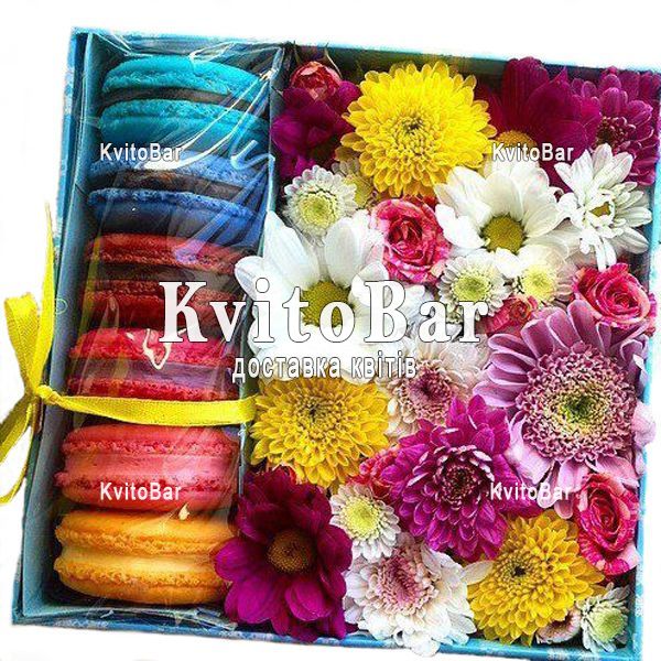 Склад:7 хризантем, 6 тістечок макарун, оформлення
