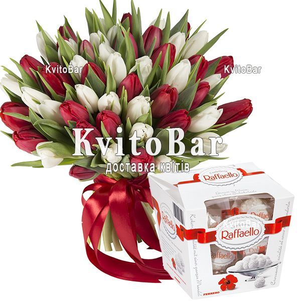 51 червоний і білий тюльпан, оформлення + Raffaello 150г