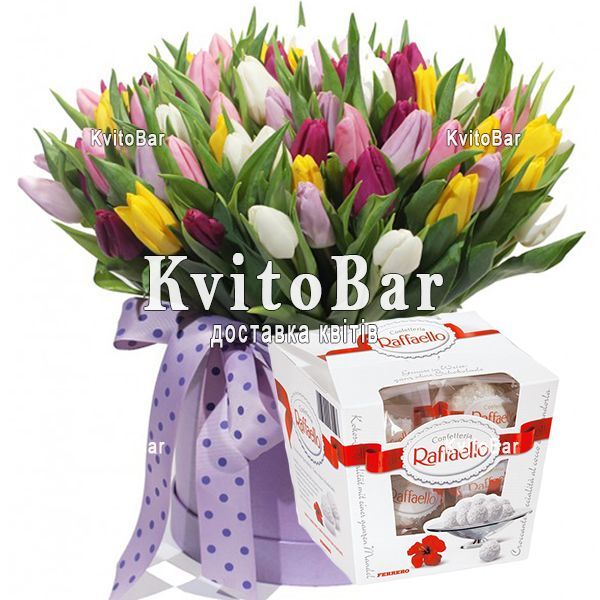 101 різнокольоровий тюльпан, коробка + Raffaello 150 г
