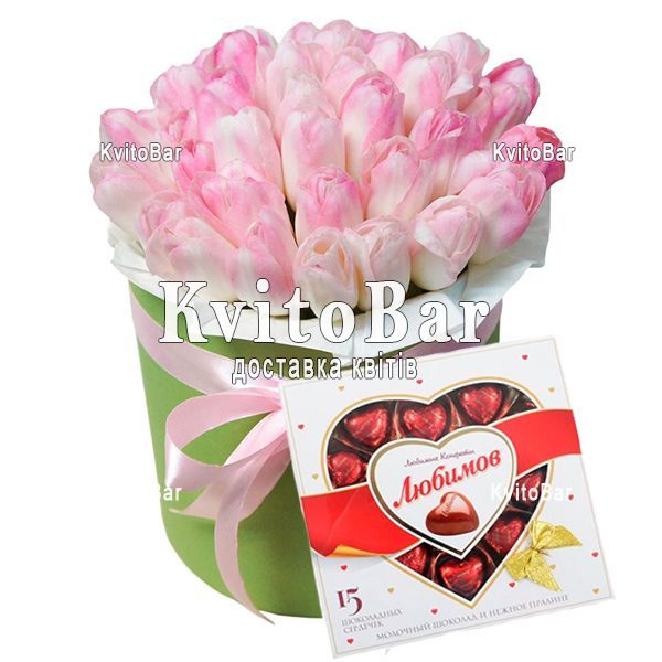 31 рожевий тюльпан, коробка + цукерки Любимов