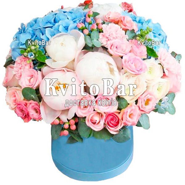 21 рожева кущова троянда, 7 рожевих гвоздик, 2 гортензії, 6 півоній, 5 білих троянд, зелень, коробка
