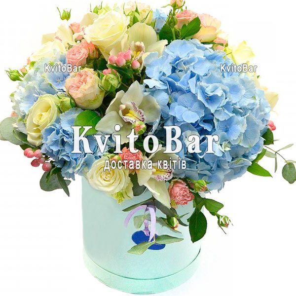 10 білих троянд, 9 кущових троянд, 4 гортензії, 6 орхідей, зелень, коробка