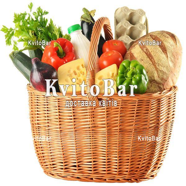 хліб - 1 шт., молоко 0.8-1 л - 1 шт., два сири твердих 160-180 г, кефір 0.8-1 л - 1 шт., яйця курячі 10 шт., капуста - 1 шт., цибуля - 1 кг, морква 1 кг, картопля 1 кг, кабачки (баклажани) - 1 кг, перець - 3 шт., огірки 1 кг, помідори 1 кг, петрушка