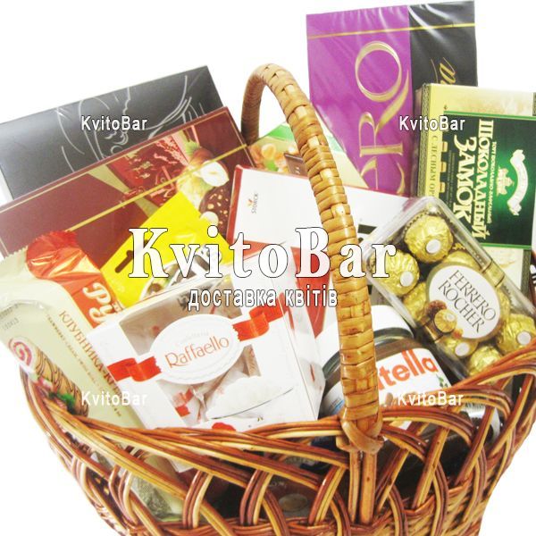 цукерки Київ Вечірній 176 г, коробка цукерок 140-285 г, драже M&M's чи Skittles 90 г, шоколадна паста Nutella чи інша, цукерки Raffaello 150 г, цукерки Merci чи інші імпортні цукерки, цукерки Ferrero Rocher 200 г, вафлі 1 упаковка, рулет бісквітний - 1 шт., шоколадка, 2 упаковки печива 180-300 г