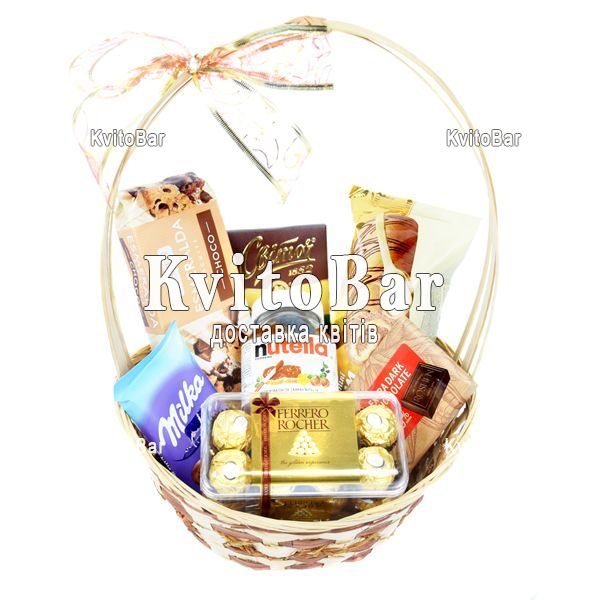 цукерки Ferrero Rocher 200 г, шоколадна паста Nutella 180-200 г чи інша, рулет бісквітний - 1 шт., печиво 1 упаковка 180-300 г, плитка шоколаду 3 шт.