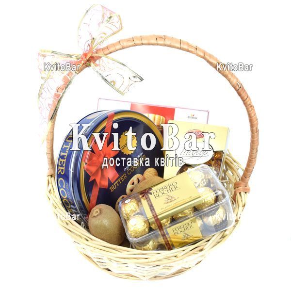 цукерки Merci чи інші імпортні цукерки, цукерки Ferrero Rocher 200 г, коробка цукерок 140-285 г, печиво в картонній або жерстяній коробці, ківі 1 кг