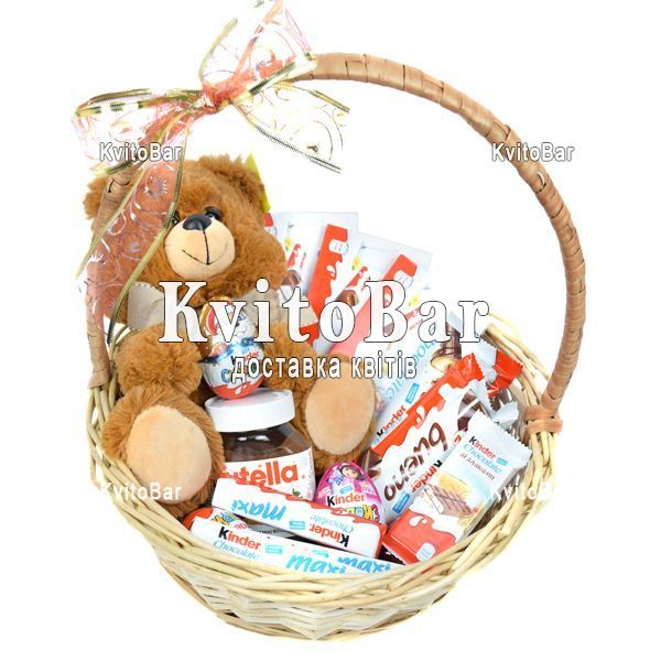 Kinder Сюрприз 3 шт., батончик Kinder Bueno чи інший батончик, батончики Kinder Chocolate MAXI чи інші шоколадні батончики - 2 шт., батончик Kinder Country чи інший шоколадний батончик, батончики Kinder Chocolate - 24 шт., шоколадна паста Nutella 180-200 г чи інша, м'яка іграшка ведмедик коричневий 20-30 см (може відрізнятись від зображеного на фото)