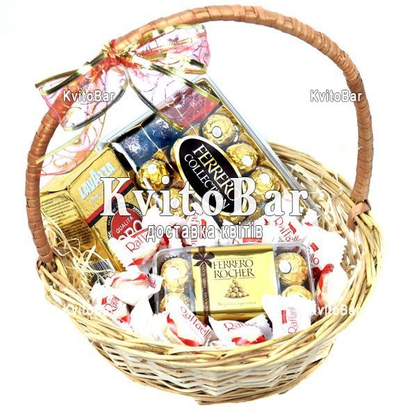 кава мелена 240-250 г, дві коробки цукерок Ferrero Rocher 200 г, цукерки Raffaello 30 шт.