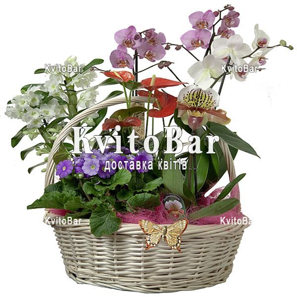 5 орхідей, антуріум, фіалка, корзина.