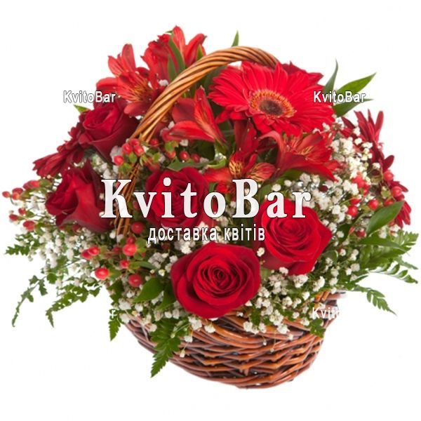 9 червоних троянд, 3 гербери, 3 альстромерії,гіперікум, гіпсофіла, зелень, корзина