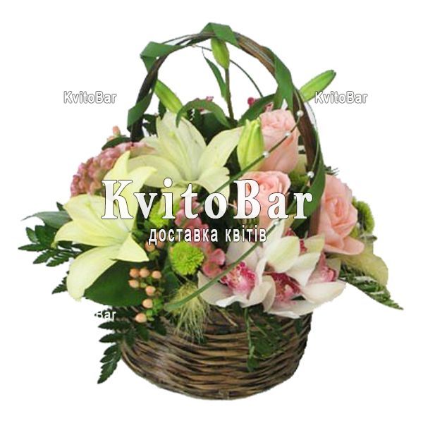 Корзина із 1 лілії, 5 троянд, 3 орхідей