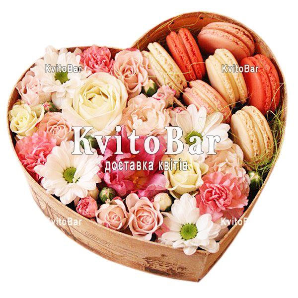 4 кущові троянди, 1 біла хризантема, 7 макарун, коробка