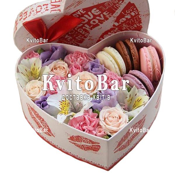 троянди, альстромерія, гвоздика, 4 макарун, коробка