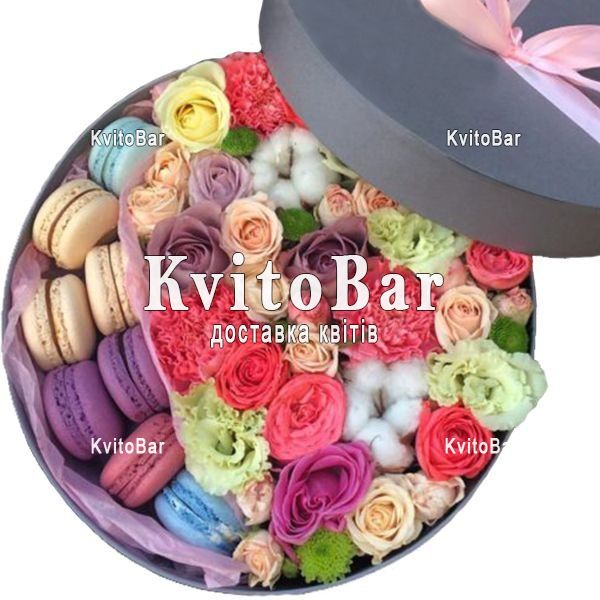 троянди, альстромерії, гвоздики, кущова троянда, хризантема, 8 макарун