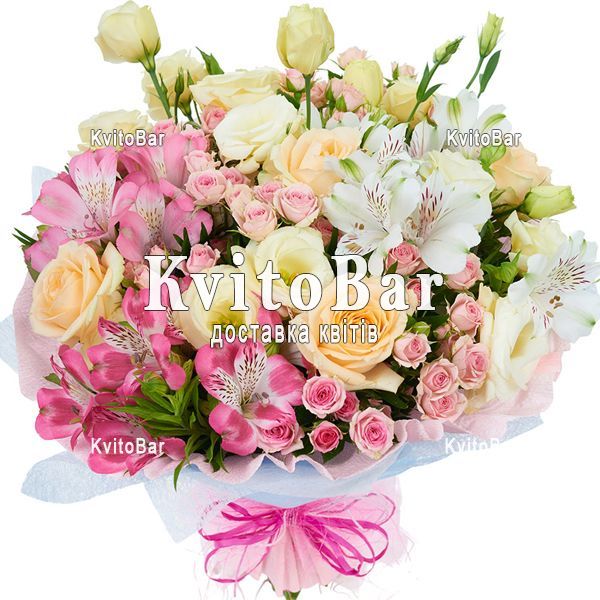 Букет із 5 троянд, 3 еустом, 6 альстромерій і 5 троянд
