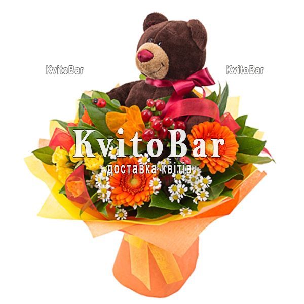 3 жовті троянди, 3 гербери, 3 хризантеми, зелень, оформлення, Ведмедик 25-30 см